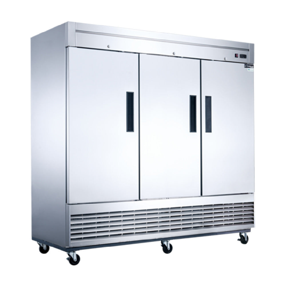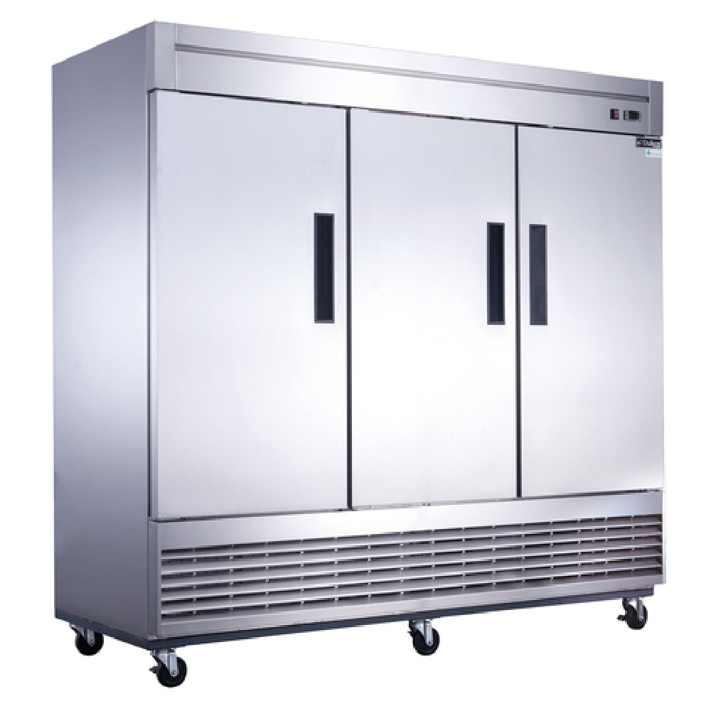 A commercial reach-in refrigerator is a large-capacity refrigeration unit designed for quick access and storage in professional foodservice operations. It typically features multiple solid or hinged doors, precise temperature controls, and durable construction to withstand frequent use in busy kitchens. The Dukers Appliance Co. USA Ltd. D83R model, with its three-section configuration, stainless steel build, and bottom-mounted refrigeration, is ideal for medium-volume restaurant or institutional environments where space efficiency, sanitation, and reliable cooling are essential for maintaining product freshness and workflow continuity.