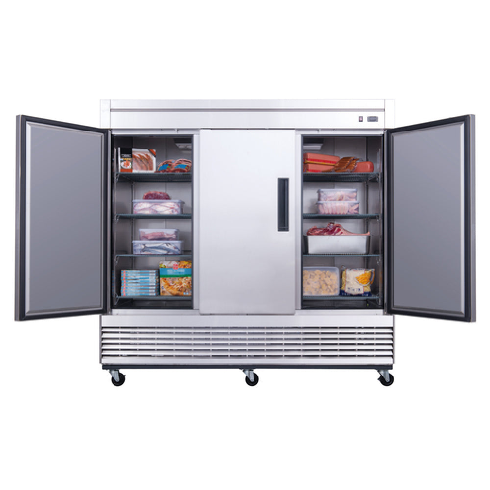 Dukers Appliance Co., USA Ltd., D83R, Refrigerator, reach-in, three-section, bottom mount self-contained refrigeration, digital temperature control, 33°F (0.5°C) to 41°F (5°C) temperature range, automatic defrost, (3) solid self-closing doors, adjustable shelves, stainless steel interior & exterior, 5" casters (2 braked), R290 refrigerant, 1 HP, 110v/60/1-ph, cETLus, ETL-Sanitation, ENERGY STAR®