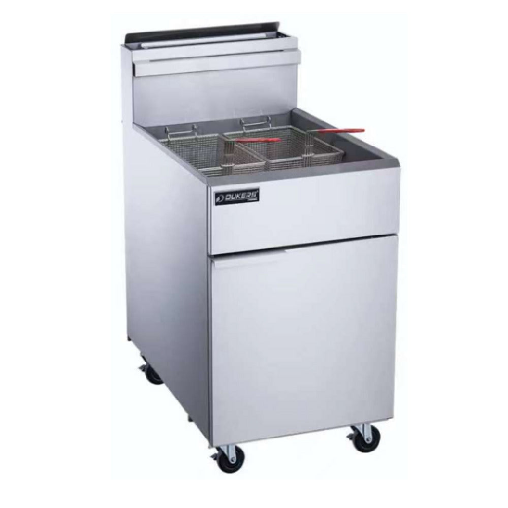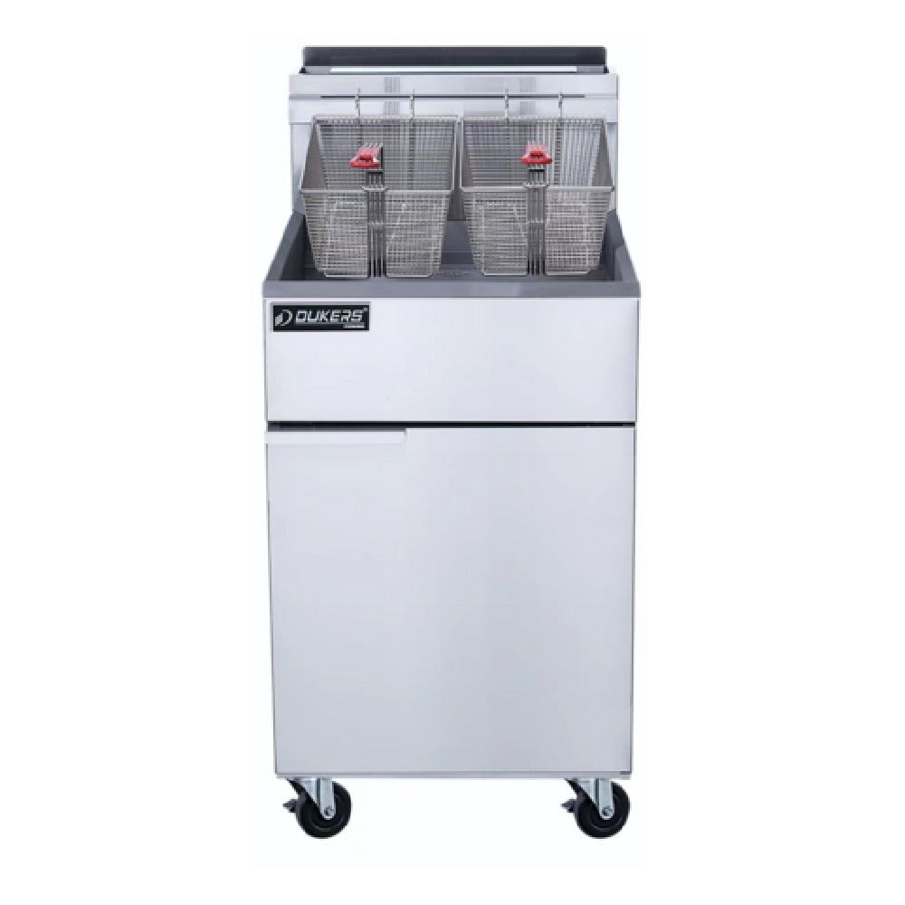A commercial fryer is a foodservice appliance designed for high-volume frying, typically used in restaurant kitchens, with capacities exceeding 50 lbs. of oil and featuring precise temperature controls. The Dukers Appliance Co. USA Ltd. DCF5-LPG is a full-pot model, suitable for busy cooking environments, offering excellent heat retention, durability with stainless steel construction, and high BTU output for rapid recovery. It is installed in larger kitchens such as quick-service restaurants and cafeterias, where consistent frying performance and operational efficiency are essential for everyday food preparation and service.
