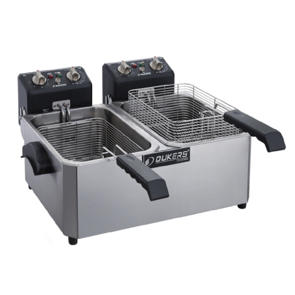 The Dukers DCF7ED commercial countertop fryer offers precise thermostatic control with thermal safety features, supported by stainless steel durable construction. The unit's double fry pot design allows simultaneous frying of different products, increasing workflow efficiency. Equipped with two heavy-duty baskets, it simplifies cleaning and product handling, ideal for high-turnover foodservice operations. Compact and built for easy maintenance, it integrates seamlessly into tight kitchen layouts, supporting consistent temperature management and safety during continuous use.