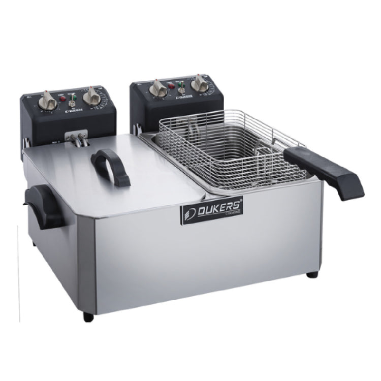 A commercial fryer is a high-capacity cooking appliance designed for frequent use in foodservice establishments, providing fast, uniform frying of various food products. The Dukers Appliance Co. USA Ltd. DCF7ED is a split-pot electric countertop fryer with double stainless steel fry tanks, supporting continuous operation in mid-volume kitchens. Its compact size makes it suitable for limited counter space, while the thermostatic controls and safety features ensure consistent, safe frying for applications such as fast-food outlets, cafeterias, and casual dining establishments.