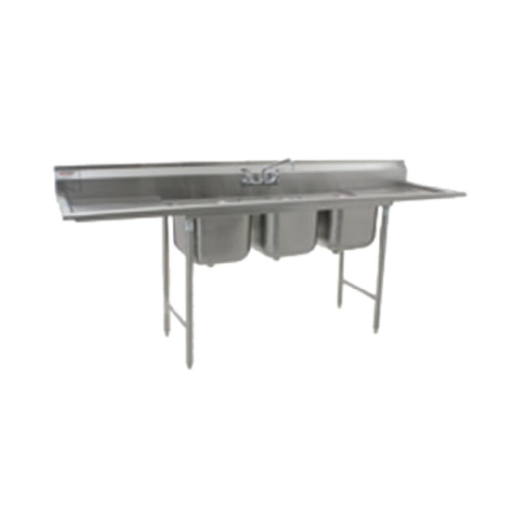 The Eagle 414-24-3-18-X 414 Series Sink Three Compartment is a commercial-grade prep station designed for high-efficiency kitchen workflows. Constructed with a durable 430 stainless steel top and 304 stainless steel sink bowls, this unit features three spacious compartments measuring 24 inches wide by 13-1/2 inches deep, optimized for segregated washing and prep tasks. Its coved corners facilitate hygienic cleaning, and the integrated 24-inch x 24-inch drainboards on each side support efficient dish handling. Measuring 114 inches in width and 31-3/4 inches in depth, this central fixture ensures ample workspace, while the 9-1/2-inch high backsplash with a 1-inch upturn maintains cleanliness and prevents splashes. Complete with galvanized legs, side crossbracing, and adjustable plastic feet, the sink offers stability and customizable height for ergonomic operation in busy commercial kitchens.