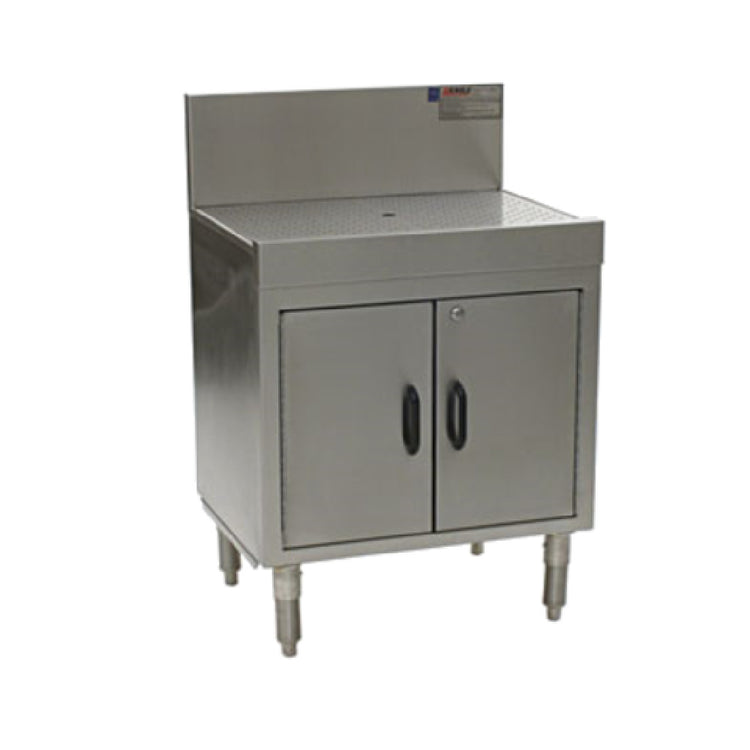 The Eagle WBCB36-24 Spec-Bar® Workboard Cabinet is a commercial-grade underbar drain workboard designed for use in professional foodservice environments. Measuring 36 inches in width by 24 inches in depth, this unit features a robust stainless steel construction with a removable perforated stainless steel insert for efficient drainage and easy sanitation. Its enclosed cabinet base includes an adjustable stainless steel shelf, optimizing storage and workflow, while the hinged doors with locks provide security and quick access. Equipped with a 1-1/2-inch I.P.S. threaded drain with nut and washer, the workboard facilitates effective wastewater management. Constructed from 304 stainless steel, this freestanding unit offers durability and corrosion resistance, suitable for high-volume hospitality kitchens, bars, and restaurants requiring reliable, sanitary work surfaces with integrated drainage capabilities.