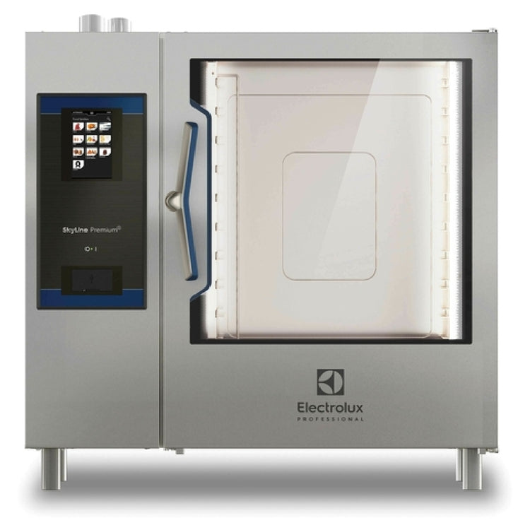 The Electrolux 219743 (LV219743) SkyLine PremiumS 102 Combi Oven Electric is a commercial-grade, electrically operated combination oven designed for professional kitchens requiring versatile cooking capabilities. Featuring a boiler system and touch screen interface, this large model supports (10) 18" x 26" sheet pans, optimizing throughput in high-demand foodservice environments. Its three cooking modes with advanced functions, combined with an Optiflow 7-speed fan and SkyClean automatic cleaning system, ensure consistent results and simplified maintenance. With a robust stainless steel interior and exterior, the unit is engineered for durability and efficient operation, making it ideal for upscale restaurants, hotel kitchens, and catering services seeking precision and reliability in multi-functional cooking equipment.
