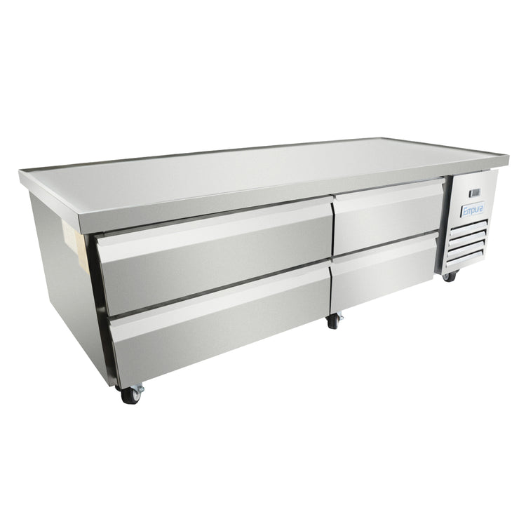 Designed specifically for commercial foodservice environments, the Empura E-KCBRC72 refrigerated stand offers reliable temperature control with a self-contained, side-mounted refrigeration system. Its stainless steel construction ensures durability while facilitating easy sanitization. The four large drawers optimize workflow, enabling quick access to stored items, and are compatible with 12" x 20" x 6" pans. This unit's robust build supports up to 1,100lbs, making it suitable for high-demand kitchen operations needing organized cold storage. The LED display provides easy monitoring, and auto defrost minimizes maintenance downtime, ensuring continuous operation in busy settings.