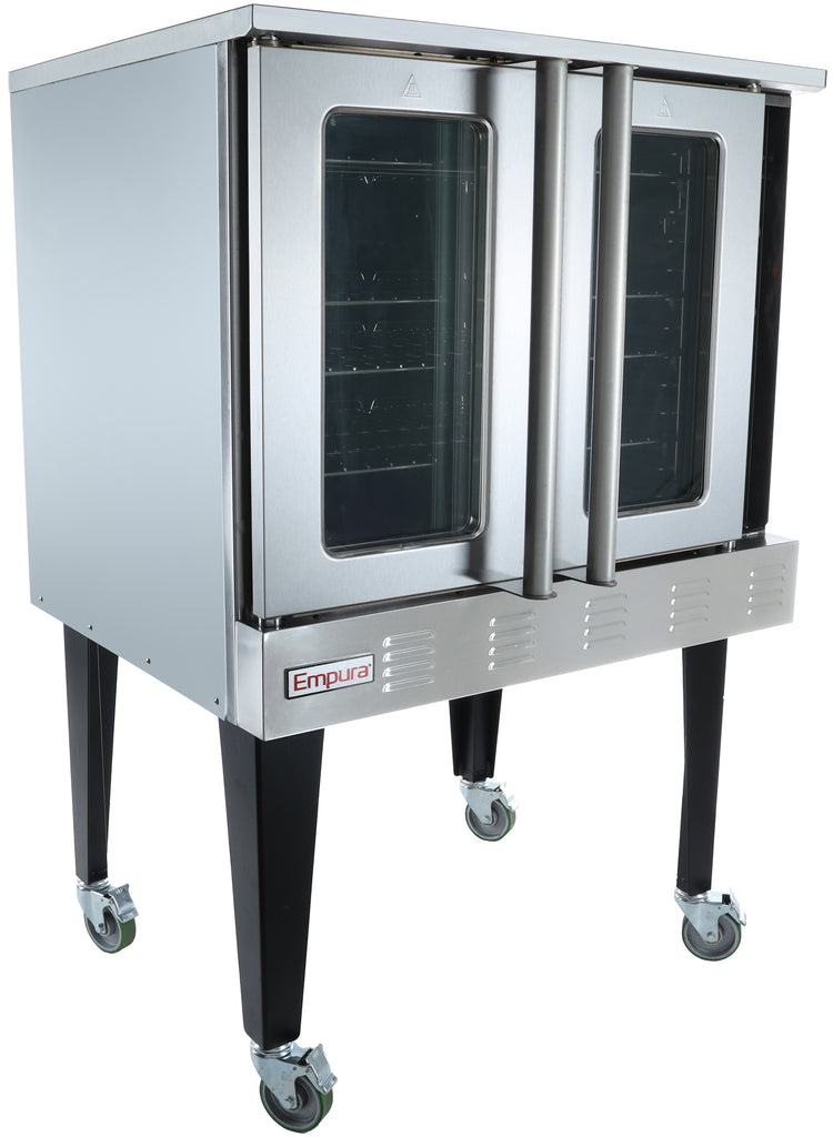 The Empura Equipment ECO-613_LP Convection Oven Liquid Propane is a commercial-grade gas convection oven designed for precise culinary processing in professional kitchens. With a robust stainless steel front and galvanized steel sides, it measures 38.15 inches wide, 40.12 inches deep, and stands 54-1/2 inches tall. Equipped with three burners and a 167-563F temperature range, this freestanding unit provides consistent heat distribution for high-volume foodservice environments. Its manual controls facilitate accurate temperature adjustments, while the 54,000 BTU output ensures powerful performance. The oven features two glass hinged doors for monitoring without heat loss and includes five adjustable racks for versatile loading. A ¾-inch rear gas connection supports efficient installation, making it ideal for restaurant, catering, or institutional applications requiring reliable, high-capacity convection cooking with liquid propane fuel.