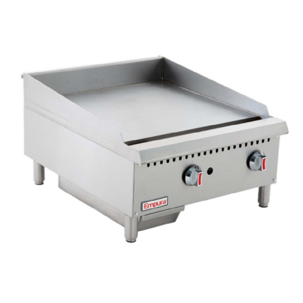 A commercial gas griddle is a heavy-duty cooking appliance designed for high-volume food preparation in professional kitchens. Typically equipped with large, flat steel or cast iron surfaces, it delivers consistent heat distribution, controlled via manual or electronic thermostats. Installed as countertop units, gas griddles such as the Empura EMG-24 are essential for preparing breakfast items, sandwiches, and stir-fried dishes. They are widely used in restaurant kitchens, cafeterias, and institutional foodservice settings, offering durable construction and reliable performance for medium-volume cooking demands.