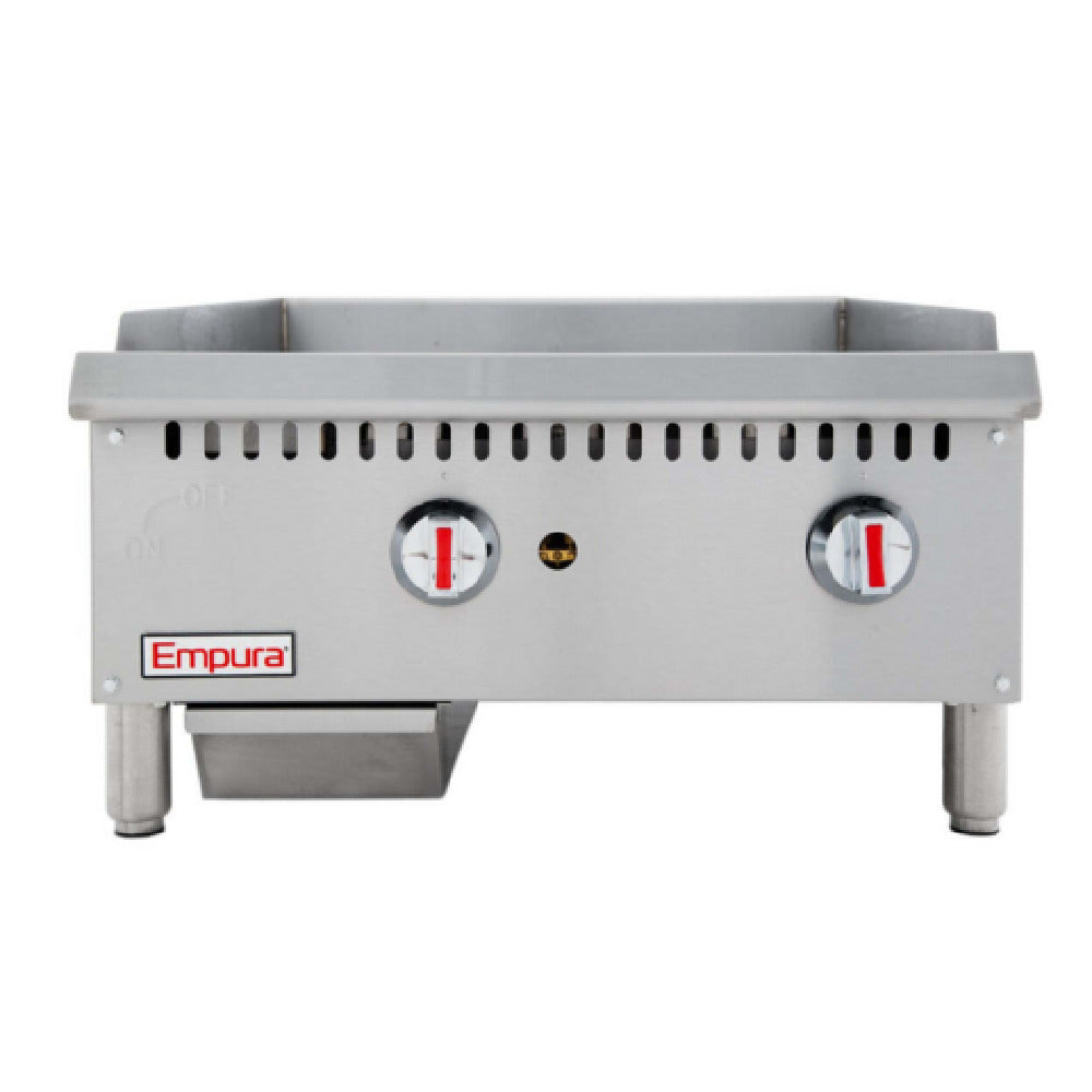 The Empura EMG-24 Heavy Duty Gas Griddle offers robust build quality, precise manual control, and a 24-inch size optimized for main cooking stations in restaurant kitchens. Designed for moderate throughput, it supports efficient food prep with its high BTU output and durable construction, making it suitable for versatile culinary operations requiring steady performance in high-traffic settings.