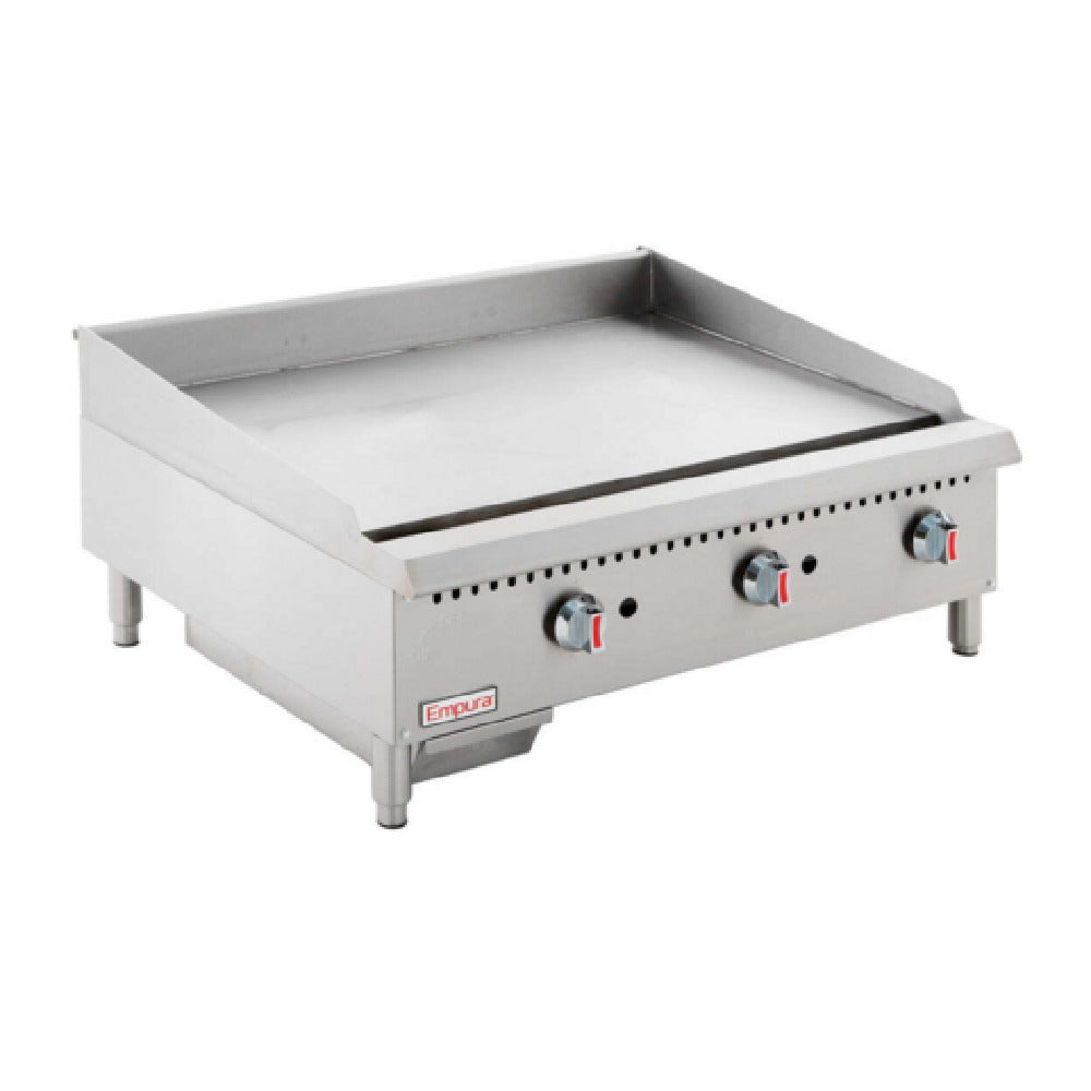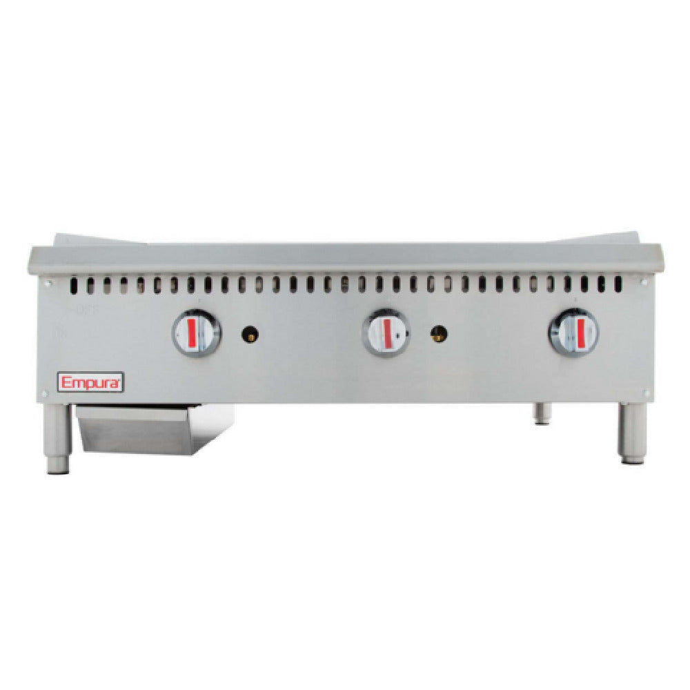 The Empura Equipment EMG-36 Heavy Duty Gas Griddle is a commercial-grade countertop cooking apparatus designed for high-demand foodservice environments. It features a 36-inch wide stainless steel front and sides exterior finish, coupled with a 3/4-inch thick steel griddle plate. Powered by a total of 90,000 BTUs through three tube and U-shape burners, this gas griddle offers precise manual temperature control via three adjustable controllers for consistent heat management across its 35.7" by 22.4" cooking surface. Its compact footprint suits bustling kitchens requiring durable, efficient griddle operation, making it ideal for restaurants, cafeterias, and catering operations that demand reliable, high-capacity cooking surfaces with field-convertible gas sources to natural or liquid propane gas.