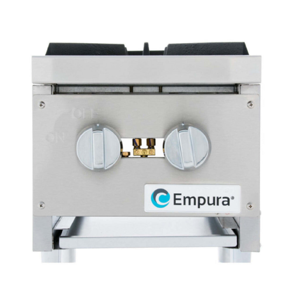 Constructed by Empura EMHP2-HD, this commercial hot plate features a durable cast iron top, high BTU output, and manual controls, ideal for medium-volume restaurant kitchens requiring reliable heat. It supports robust operation with field conversion for LP gas and is designed for easy integration into busy food prep environments, providing consistent performance across high-demand service periods.
