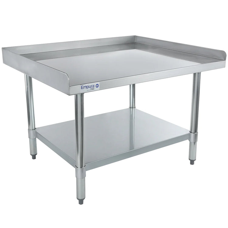 A stainless steel equipment stand with an upper surface featuring three raised edges, four cylindrical legs, an Empura brand logo on the front, and a lower storage shelf. NSF certified for safe kitchen or industrial use.