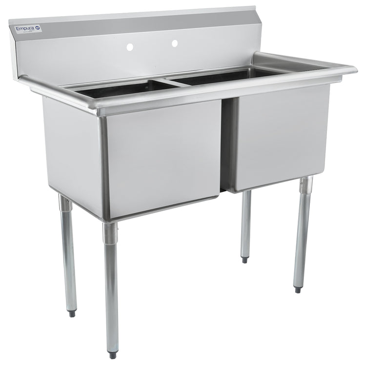 The Empura Stainless ESD21818 Sink is a durable, commercial-grade two-compartment sink designed for high-traffic foodservice environments. Constructed from 18 gauge 304 stainless steel, it provides robust resistance to corrosion and daily wear. Measuring 43 inches in width, 23.5 inches in depth, and standing at 44.25 inches high, this model features two 18-inch long x 18-inch wide x 14-inch deep bowls, optimized for efficient washing and prep tasks in busy kitchens. Its 9.75-inch back splash enhances splash control, while the galvanized legs with plastic adjustable feet facilitate stable installation. The sink's specifications and sturdy materials make it suitable for moderate workflow applications requiring reliable sanitation and durability.