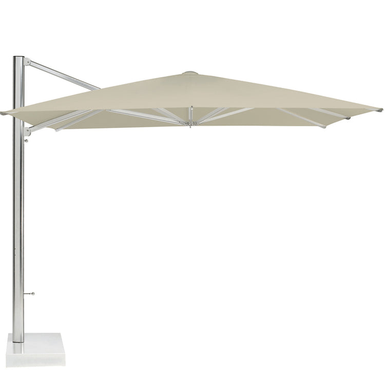 emuamericas, llc, E981-90-98/B8.N, Shade Cantilever Umbrella, 10 ft., square top, 5-1/2" dia. side post, anodized aluminum pole, ribs, struts, hubs, and finial, crank lift, 4 position rotational locking mechanism, two canopy positions, with vent, pocket less canopy attachment, all repairable construction, 540 lb. white metal cover base over (4) granite plates, assembly required