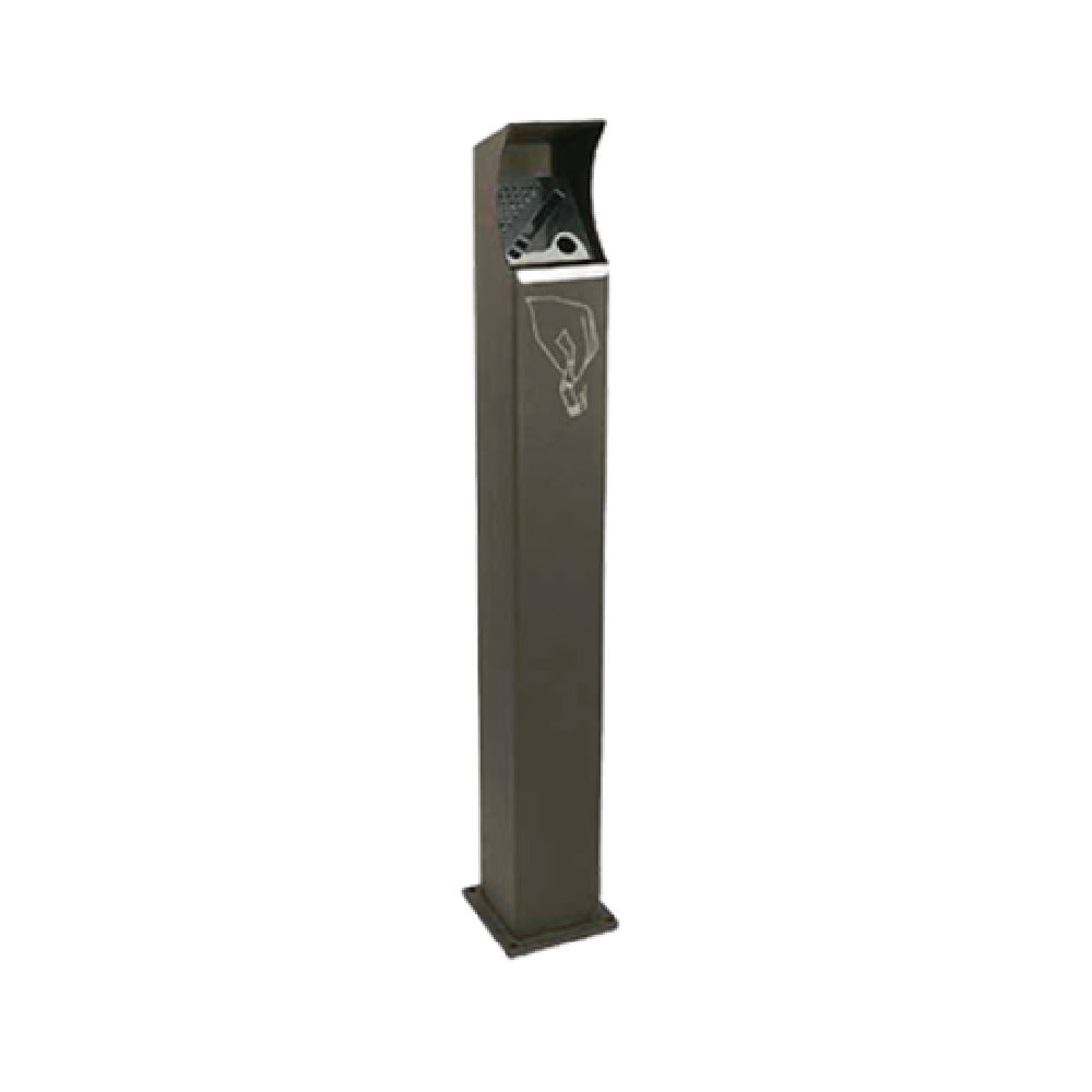 The Emuamericas LLC UVC1-8019 Clash Ashtray is a commercial smoking station designed for outdoor and designated smoking areas. Crafted with durable stainless steel and galvanized steel framing, this ashtray features a square, stand-up design measuring 6-1/2" x 6-1/2" with a height of 39-1/2 inches. Its locking system and bolt-down mounting ensure stability and security in high-traffic environments, making it suitable for hospitality venues, outdoor seating areas, or industrial settings requiring a reliable waste receptacle for cigarette disposal. The glossy grey brown finish (RAL 8019) provides corrosion resistance and aesthetic appeal suited for commercial applications.