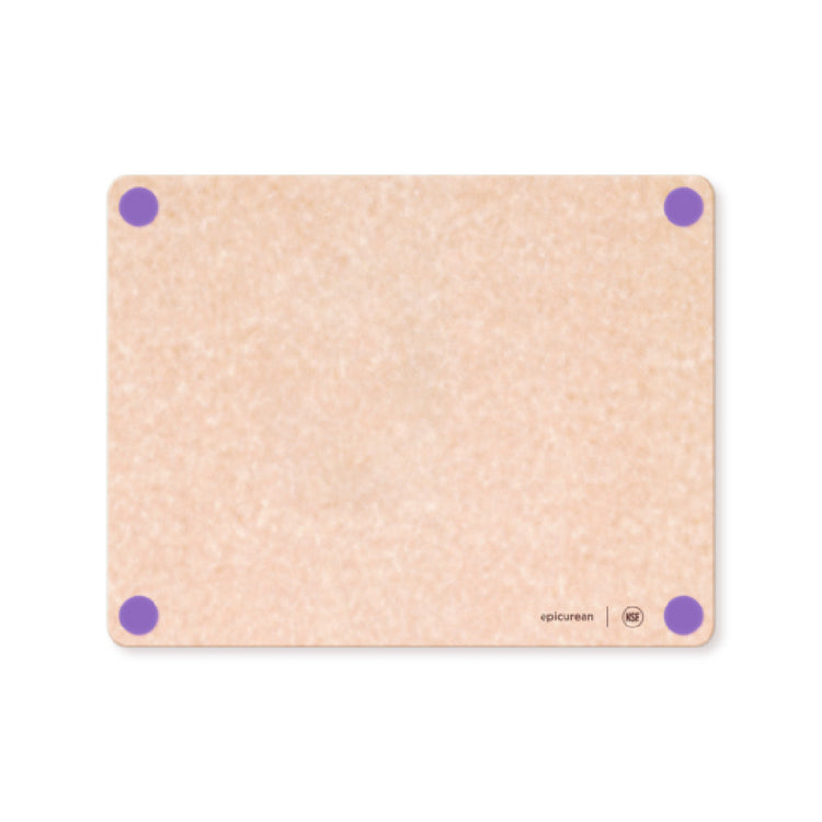 Built for demanding foodservice environments, this Epicurean prep board is made from natural paper composite, certified NSf, and is manufactured in the USA. Its dimensions are 14-1/2 inches long by 11-1/4 inches wide with a thickness of 3/8 inches, providing a stable cutting surface. The board features purple color-coded silicone non-slip feet that adhere securely to work surfaces, reducing slip-related accidents. Designed for ease of cleaning, it is dishwasher safe and resistant to stains and odors, supporting quick turnaround times. Its construction balances durability with lightweight handling for efficient workflow, making it suitable for prep stations in commercial kitchens, catering, and institutional foodservice.