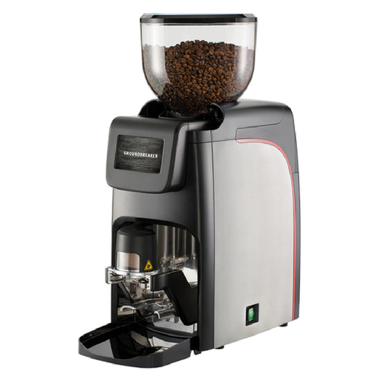 The Espresso Soci GROUNDBREAKER AUTOTAMPER Groundbreaker Grinder Electric Compact is a professional-grade coffee grinding solution designed for commercial foodservice environments. This electronic slicing burr grinder features a 64mm diameter titanium-coated burr system for precise particle consistency, a 3.53 lb. hopper capacity optimized for moderate workloads, and an integrated auto tamper for streamlined workflow. Its compact footprint measures 8.47" W x 15.72" D x 22.92" H, combining durability with versatile integration into countertop setups. Engineered for reliability and high-performance operation, it provides consistent grind quality in busy cafe, restaurant, or specialty coffee shop applications, with a focus on efficiency and ease of maintenance at 50 lbs weight for ease of handling and setup.