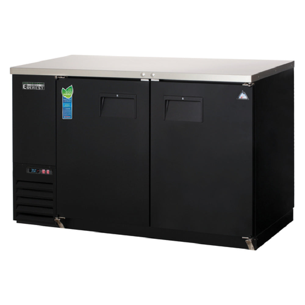 The Everest Refrigeration EBB59 Back Bar Refrigerator Two-section 57-3/4"W is a commercial-grade refrigeration unit designed for professional bar and hospitality environments. This dual-section back bar cabinet features self-contained, side-mounted refrigeration that maintains consistent temperatures for beverage storage. With a capacity of 20.0 cubic feet, it accommodates (640) 12 oz. cans or (408) 12 oz. bottles, optimizing space and accessibility. Constructed with a stainless steel top, black laminated exterior, galvanized steel interior walls, and a stainless steel floor, it offers durability and sanitation suited for high-volume foodservice settings. Equipped with digital controls, LED display, auto defrost, and interior LED lighting, it supports efficient workflow and easy maintenance. Its precise technical build ensures reliable performance in busy hospitality operations, making it ideal for bars, restaurants, and catering venues seeking resilient, professional beverage refrigeration.