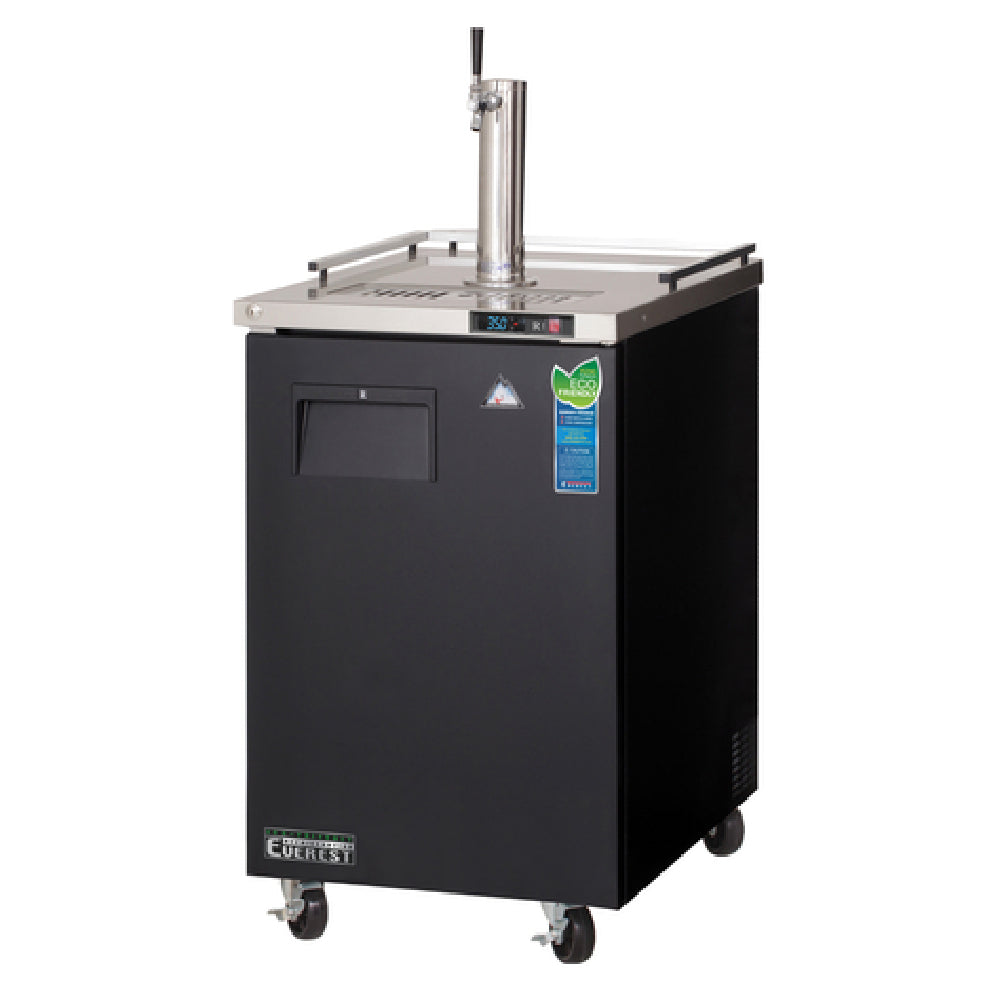 The Everest Refrigeration EBD1 Direct Draw Keg Refrigerator is a commercial draft beer cooler designed for precise temperature control and efficient beer storage. With a one-section configuration and a width of 23-1/2 inches, this unit offers an 8.0 cu. ft. capacity tailored for mid-volume foodservice operations. Its self-contained, side-mounted refrigeration system ensures consistent cooling for 1/2 barrel kegs, making it suitable for bars, restaurants, and hospitality venues requiring reliable draft beer dispensing. The model features a flat top with a stainless steel countertop and rail, a solid hinged locking door, and a stainless steel draft tower with an air distributor and faucet. Technical details include its controlled environment, utilizing R290 hydrocarbon refrigerant, an energy-efficient 1/5 HP compressor, and digital controls with LED display for precise temperature management. This unit emphasizes durability with galvanized steel interior walls and stainless steel flooring, optimized for sanitation and ease of maintenance. Overall, the Everest EBD1 enhances beverage presentation and workflow efficiency in commercial settings requiring dependable draft beer refrigeration.