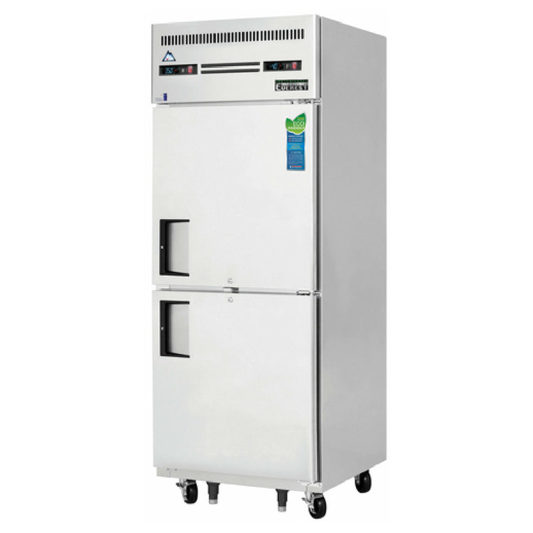 The Everest Refrigeration ESRFH2 Reach-In Dual Temperature Refrigerator/Freezer Combo is a commercial refrigerator freezer designed for precise temperature control in high-demand foodservice environments. Constructed with stainless steel front and sides, this single-section unit offers a 29-1/4" width and a capacity of approximately 11.0 cubic feet for refrigeration at the top and 11.0 cubic feet for freezing at the bottom. Equipped with self-contained top-mounted refrigeration, it features a 1/2 HP compressor and electronic digital controls with LED display. The unit’s interior stainless steel finish and epoxy-coated wire shelves facilitate sanitation and durability, while hinged, self-closing, field-reversible half-doors ensure security and ease of access. The inclusion of pressure relief ports, LED interior lighting, and stabilizers supports efficient operation, making this unit suitable for perishable storage in busy commercial kitchens, supermarkets, or convenience stores. It maintains precise temperature zones with a temperature operating range suitable for refrigerated and frozen storage, ensuring optimized workflow and food safety.