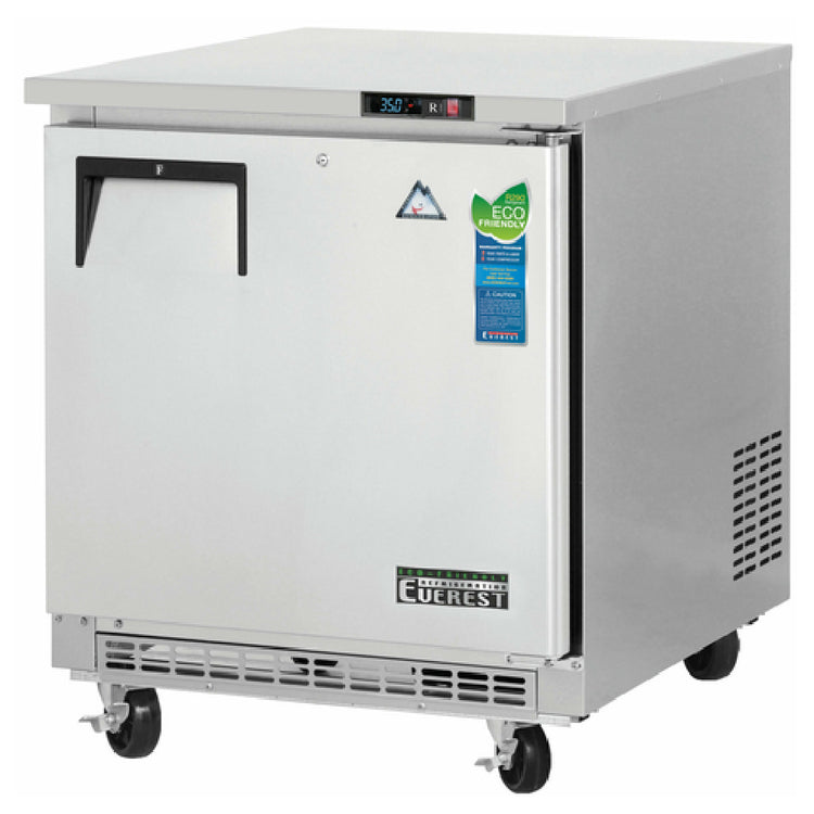 Everest Refrigeration, ETBR1, Undercounter/Worktop Refrigerator, one-section, 27-3/4"W, 7.5 cu. ft. capacity, self-contained rear mounted refrigeration, 16 gauge stainless steel worktop, (1) solid hinged self-closing door (locking), (2) epoxy coated wire shelves, height adjustable clips, digital controls with LED display, defrost cycle with heater, front air breathing, pressure relief port, stainless steel interior, stainless steel front & sides, galvanized steel bottom & rear, (4) 5" swivel casters (2 locking), R290 Hydrocarbon refrigerant, 1/5 HP, 115v/60/1-ph, 2.5 amps, cord, NEMA 5-15P, NSF, cETLus, ETL-Sanitation, ENERGY STAR®