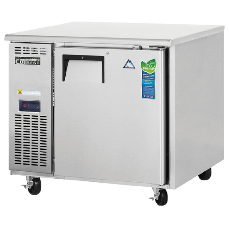 The Everest Refrigeration ETF1 Undercounter/Worktop Freezer One-section 35-5/8"W is a commercial-grade refrigeration unit designed for precise cold storage in foodservice environments. This model features a self-contained, side-mounted refrigeration system with a 1/3 HP compressor, providing reliable cooling across a temperature range of -10°F to +54°F. Its 9.0 cubic foot capacity and compact 35-5/8" width make it suitable for undercounter applications or workspace integration in busy kitchens. Built with durable stainless steel interior and exterior, it ensures long-lasting performance while maintaining sanitation standards. The unit includes epoxy-coated wire shelves with adjustable clips, a solid hinged self-closing door with a locking mechanism, LED interior lighting, and digital controls with an LED display for precise temperature management. Equipped with overheat protection alarms and a pressure relief port, the ETF1 supports efficient workflow and easy maintenance in demanding foodservice settings.