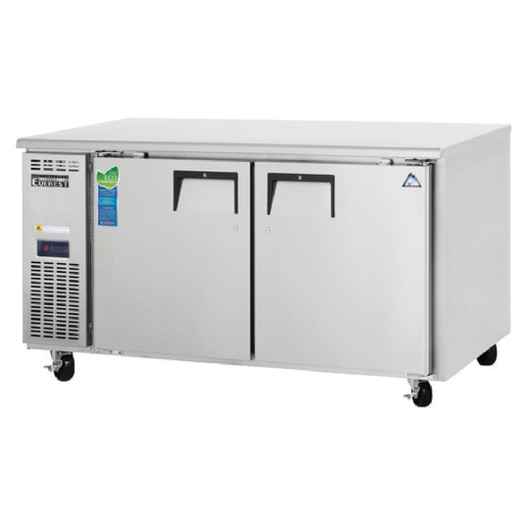 Everest Refrigeration, ETWR2, Undercounter/Worktop Refrigerator, two-section, 59-1/4"W, 18.0 cu. ft. capacity, self-contained side mounted refrigeration, 16 gauge stainless steel worktop, (2) solid hinged self-closing doors (locking), (4) epoxy coated wire shelves, height adjustable clips, digital controls with LED display, auto defrost, LED interior lighting, pressure relief port stainless steel interior, stainless steel front & sides, galvanized steel bottom & rear, (4) 5" swivel casters (2 locking), R290 Hydrocarbon refrigerant, 1/4 HP, 115v/60/1-ph, 3.5 amps, cord, NEMA 5-15P, NSF, cETLus, ETL-Sanitation