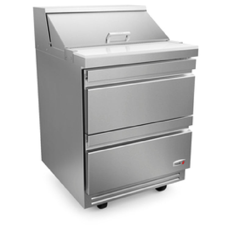 This model features a 27-3/4-inch wide stainless steel exterior with a height of 44.63 inches and depth of 30.13 inches, optimized for compact yet spacious countertop placement. Its front-breathing, self-contained refrigeration system operates on standard commercial electrical specifications—voltage, frequency, phase, and amperage are designed to meet typical foodservice electrical standards, with an estimated wattage suited for commercial kitchen use. The unit’s refrigeration is air-cooled, providing reliable thermal performance, and has a production capacity appropriate for moderate daily loads. Weighing approximately 234 pounds, the unit includes two drawers with durable construction suitable for heavy, repeated use. It complies with safety and sanitation standards, featuring stainless steel interiors and surfaces that facilitate HACCP-compliant cleaning routines. The cooling system’s operating temperature range and safe temperature limits ensure food safety and product freshness in busy settings.