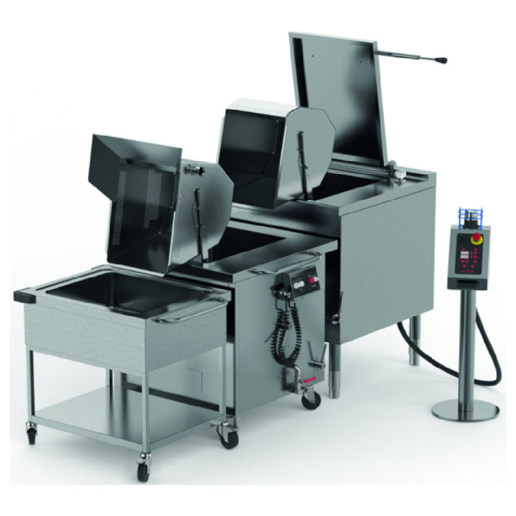 The Firex ULPCG2-48 multicooker offers dual 48-gallon basins with programmable electronic controls and touch interface for accurate, automated cooking and blanching. Crafted from stainless steel, it ensures durability in demanding culinary settings. Spring-balanced hinged lids facilitate quick access and cleaning, while the insulated trolley enhances mobility within the kitchen. Designed for medium-use foodservice environments, it supports efficient workflow and reliable performance during continuous operation.