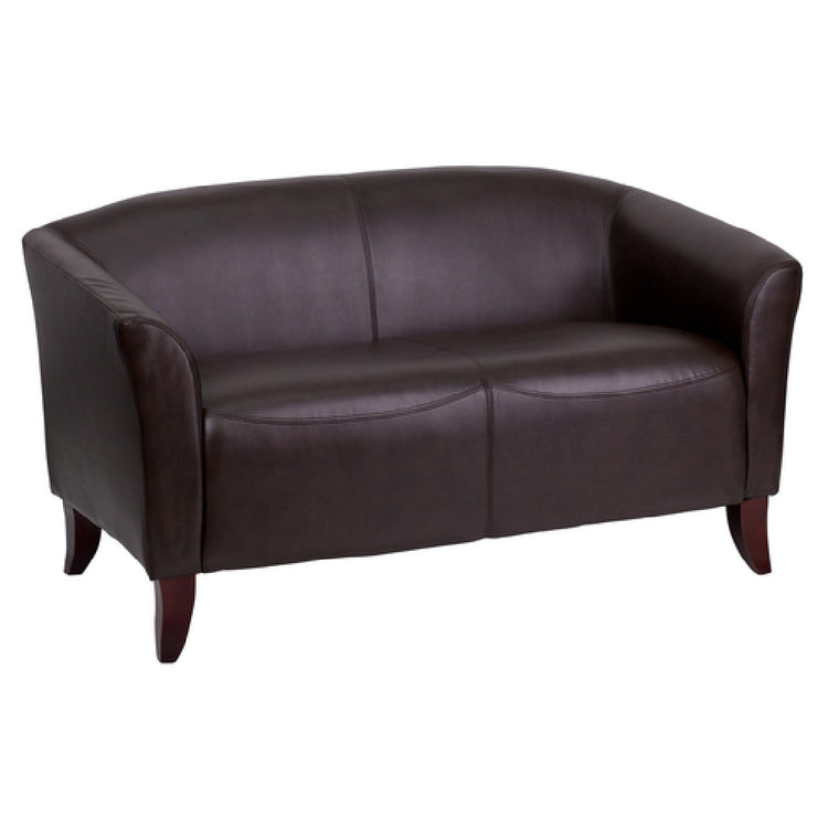 The Flash Furniture Hercules Imperial Series Reception Loveseat (Model Number 111-2-BN-GG) is a commercial-grade indoor sofa seating unit designed specifically for reception areas, waiting rooms, and lounge spaces within professional environments. Featuring LeatherSoft upholstery, it offers a durable, easy-to-clean surface suitable for high-traffic use. With dimensions of 52 inches in width, 29 inches in depth, and 29 inches in height, it provides an ergonomic seating solution supported by high-density CA117 fire retardant foam and a sturdy hardwood construction. Cherry stained wood feet enhance stability and aesthetic appeal, making this loveseat a reliable, restaurant-ready component for modern hospitality or corporate waiting areas.