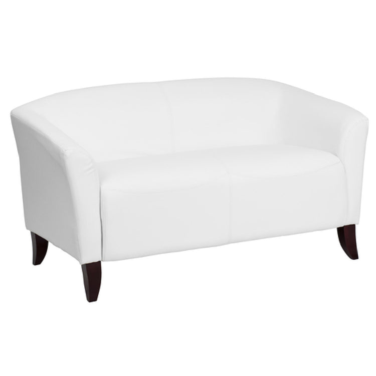 The Flash Furniture Hercules Imperial Series Reception Loveseat, model 111-2-WH-GG, is a commercial-grade indoor sofa seating solution designed for waiting areas, lobbies, and reception spaces. Measuring 52 inches wide by 29 inches deep and 29 inches high, this loveseat features durable LeatherSoft upholstery with a soft, leather-like feel, complemented by sloping arms and a slightly curved seat and back for ergonomic comfort. Constructed with sturdy hardwood frames and finished with cherry-stained wood feet, it ensures long-term durability and stability. Equipped with a fixed seat cushion and high-density CA117 fire-retardant foam, this unit prioritizes safety and maintenance ease, making it suitable for high-traffic commercial environments. Its technical specifications support seamless integration into professional waiting areas and reception zones, combining comfort with resilience.