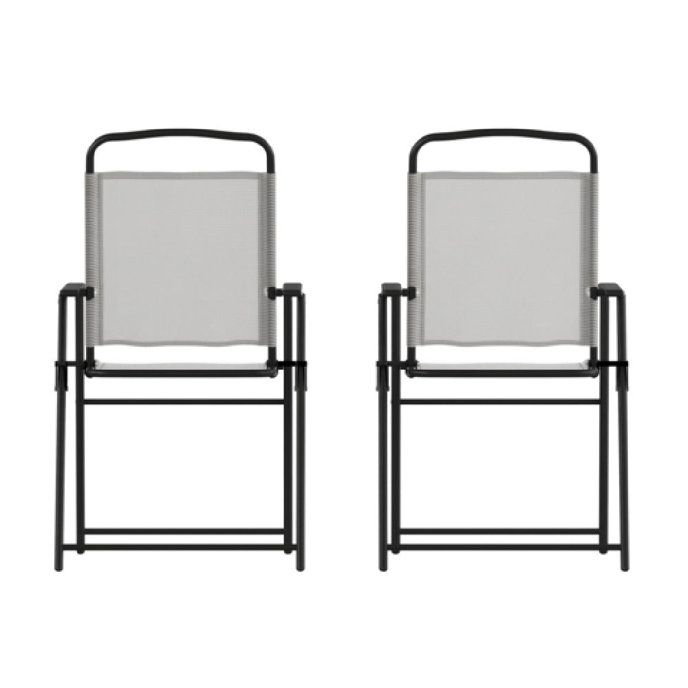 The Flash Furniture 2-GM-SC098-GY-GG folding outdoor chair features a powder-coated steel frame with a weight of 16 lbs, designed for resistance to corrosion and impact in various weather conditions. Its dimensions, measuring 20.75 inches in width, 24.5 inches in depth, and 35.75 inches in height, accommodate standard outdoor seated comfort. The breathable Textilene fabric back and seat are UV fade resistant, ensuring longevity in sun-exposed environments. With a maximum load capacity of 350 lbs., this chair supports medium-demand outdoor seating workflows typical of hospitality or event settings. No assembly is required, and the chair supports quick deployment and easy cleaning, making it a reliable choice for high-throughput outdoor applications.