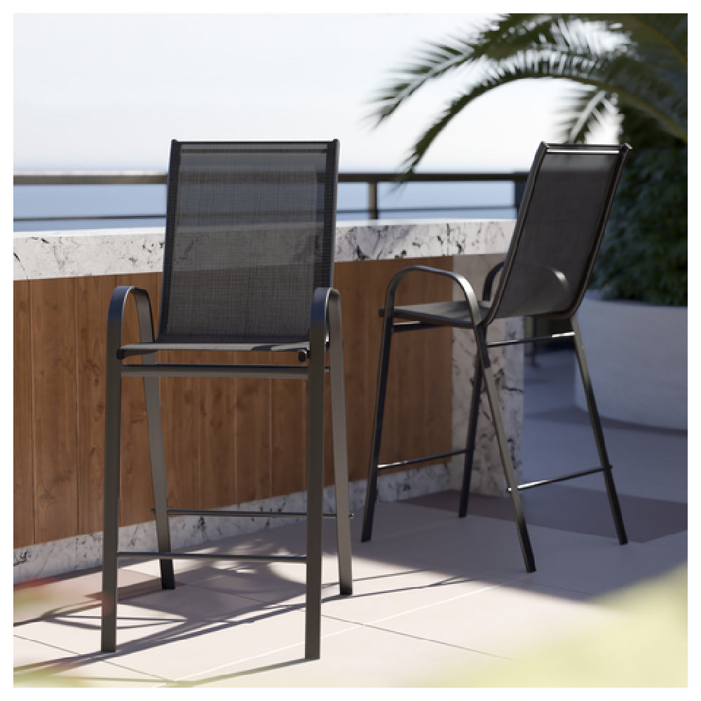 The Flash Furniture Brazos Series Stacking Patio Barstool (model 2-JJ-092H-GG) is a commercial outdoor seating solution designed for frequent use in hospitality, restaurant, and outdoor entertainment environments. This bar-height stool features a durable black metal frame construction combined with a black textilene fabric seat for weather resistance and longevity. With a weight capacity of 352 pounds, it balances high performance and robustness. Stackable up to four units, this stool optimizes space efficiency for storage or multi-unit setups, making it suitable for venues with variable seating requirements. Its full rectangular back and curved arms provide ergonomic support while maintaining an aesthetic appeal aligned with outdoor furniture standards. At 50 inches in height, it provides ample clearance for bar-height surfaces, ensuring functional versatility in commercial patio or outdoor bar settings.