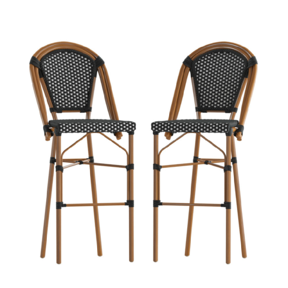 Flash Furniture, 2-SDA-AD642001-BS-BKWH-NAT-GG, Bordeaux Stacking French Bistro Stool, 600 lb. weight capacity, 30" bar seat height, black and white polyethylene rattan back and seat, natural finish bamboo print aluminum frame, floor glides, designed for indoor/outdoor use, stacks up to 5 chairs high, set of 2 (no assembly required)