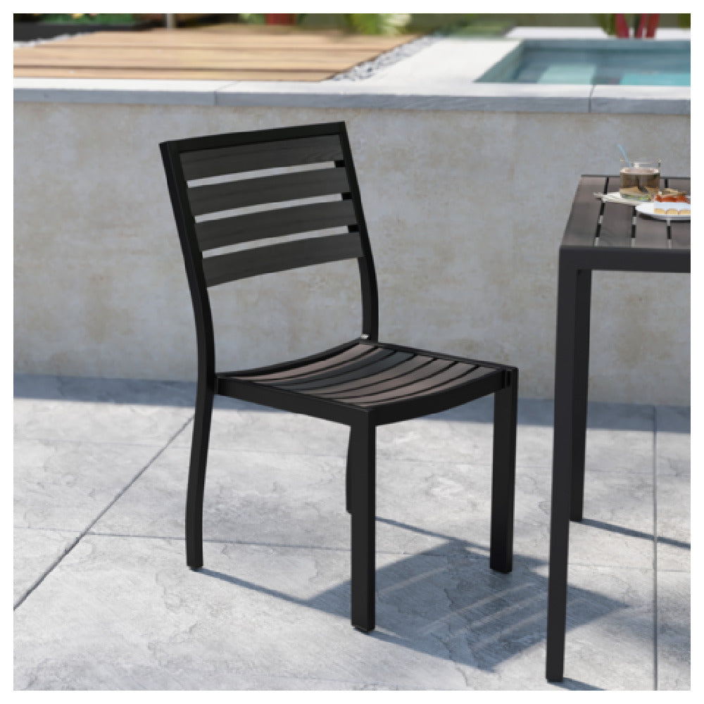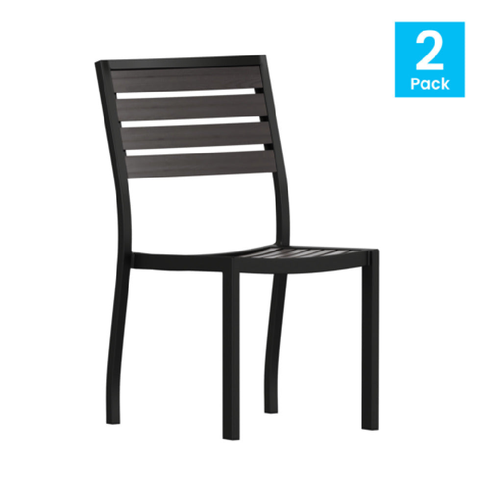 The Flash Furniture 2-XU-DG-HW6036-GY-GG Lark Side Chair is a commercial-grade outdoor side chair designed for durable performance in hospitality and foodservice environments. Crafted with a black powder-coated aluminum frame, it offers weather-resistant properties suitable for outdoor use. Featuring a horizontal slat pattern back and seat with a 300 lb. weight capacity, this chair provides reliable support for high-traffic settings. Its compact dimensions of 18-3/4"W x 22"D x 33-1/2"H make it ideal for patio seating, outdoor dining areas, or restaurant terraces, combining sturdy construction with a sleek faux teak finish for aesthetic appeal. Fully assembled and ready to deploy, this set of two units is optimized for quick installation in commercial outdoor dining landscapes.