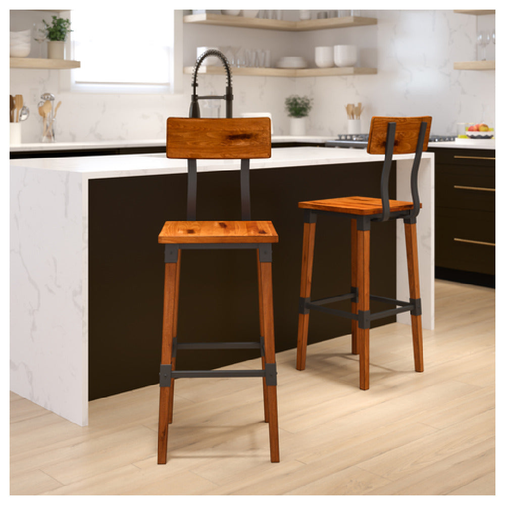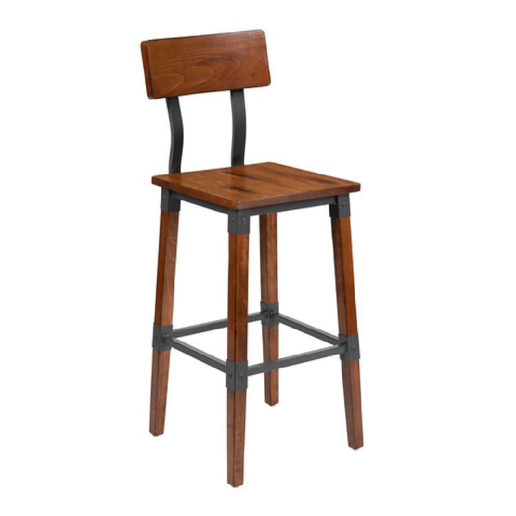 A commercial bar stool is a high-capacity, durable seating fixture designed for frequent use in hospitality environments such as restaurants, bars, and cafés. The Flash Furniture 2-XU-DG-W0236B-GG features mortise and tenon joints reinforced by metal screws, supporting up to 500 pounds. It includes a wood seat and back with a rustic walnut finish, ideal for high-volume venues seeking long-lasting, easy-to-clean seating options installed at bar or counter heights, supporting efficient workflow and customer comfort.