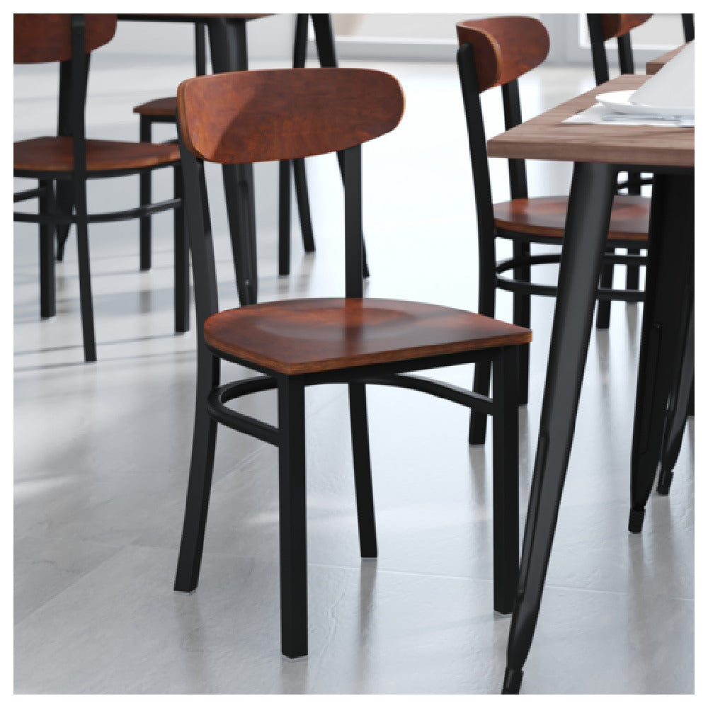The Flash Furniture Wright Dining Chair (Model 2-XU-DG6V5B-WAL-GG) features a durable steel frame finished in black, supporting a walnut-finished wooden seat and backrest. It measures 16.25 inches in width, 18 inches in depth, and 31.37 inches in height, weighing 82 pounds. The chair supports a maximum load of 500 lbs, suitable for demanding commercial environments. Its fixed floor glides facilitate stable placement on various surface types, while assembly involves standard setup procedures. The product is built with consideration for frequent cleaning and maintenance, with a construction that emphasizes longevity and performance in high-traffic settings. Designed for indoor use, it reliably supports typical restaurant and cafeteria workflows with ergonomic support and stability.