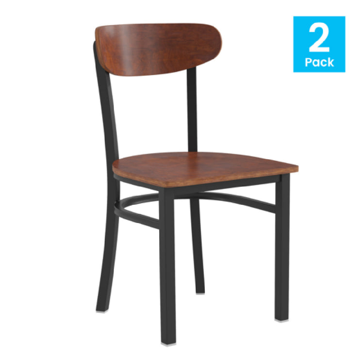 The Flash Furniture Wright Dining Chair (Model 2-XU-DG6V5B-WAL-GG) is a commercial-grade side chair designed for indoor dining environments requiring high durability and substantial weight capacity. Constructed with a sturdy black steel frame, it features a walnut-finished wooden seat and a contoured boomerang-style backrest, providing ergonomic support for extended seating. Its 500 lb. weight capacity makes it suitable for a variety of institutional and hospitality settings, ensuring safe and reliable use in busy dining areas. The fixed floor glides facilitate stability while allowing for easy repositioning, making this chair an ideal option for commercial foodservice applications requiring robust seating solutions. The product measures 16.25 inches in width, 18 inches in depth, and 31.37 inches in height, with a weight of 82 pounds, embodying a combination of durability and functional design optimized for high-volume use cases. Assembly is required for setup.
