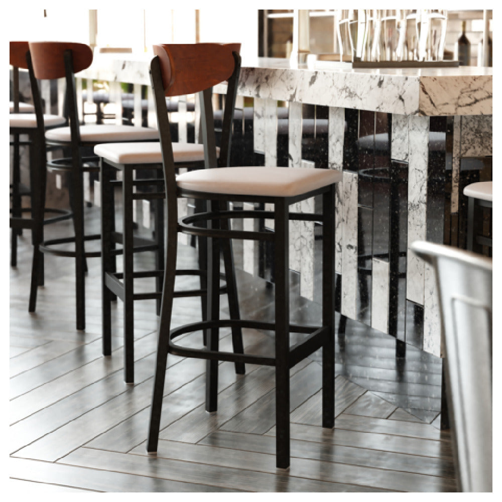 This model stands out with its 500-pound weight capacity, durable steel construction, and contemporary walnut finish, making it more robust and visually appealing than many competitors. Its fixed height and easy-to-clean vinyl surface streamline maintenance and setup in fast-paced foodservice settings. Additionally, its support for high-volume seating improves operational efficiency and customer experience, setting it apart from standard indoor bar stools.