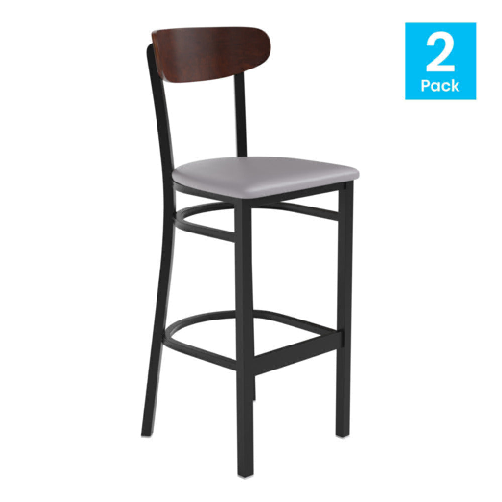 Flash Furniture, 2-XU-DG6V6GYV-WAL-GG, Wright Bar Stool, 500 lb. weight capacity, gray vinyl upholstered seat, wooden boomerang back, black steel frame, lower bracing footrest, fixed floor glides, walnut finish (set of 2) (assembly required)