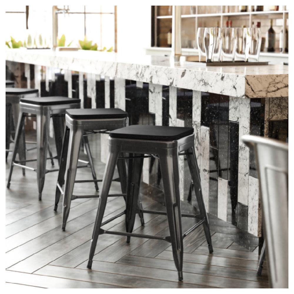 The Flash Furniture Cierra stacking bar stool features a height of 24.75 inches, width and depth of 16 inches, and a weight of 59 pounds for robust on-site stability. Its construction involves a metal frame with a corrosion-resistant powder-coated finish, supporting daily use in high-traffic environments. The black poly resin seat maintains color stability and cleanability under typical indoor conditions, with a maximum operating temperature suitable for standard indoor climate ranges. Its design avoids complex installation, requiring minimal assembly, primarily involving securing the seat to the frame. The stool’s dimensions facilitate effective placement around bars, counters, or islands, while its stacking capability enhances storage in constrained spaces.
