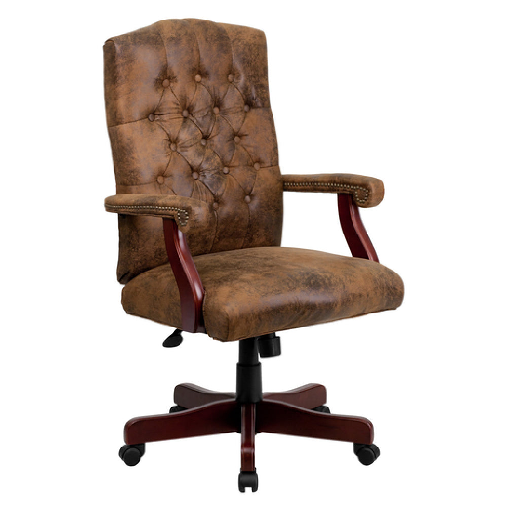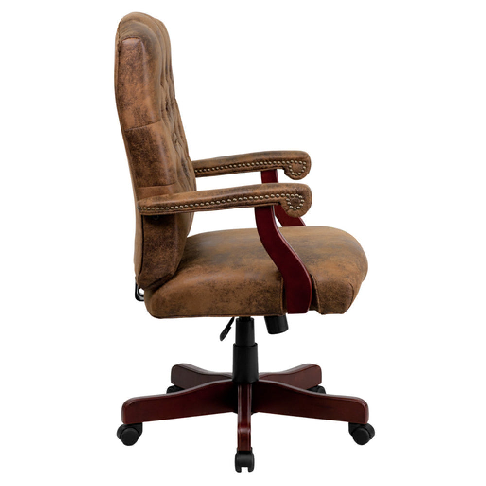 The Flash Furniture 802-BRN-GG features a robust steel construction with a mahogany-finished metal base, supporting a maximum weight of 250 lbs. Its adjustable height mechanism operates smoothly within a range of 43-3/4" to 47-1/4" with a tilt lock and tension control for ergonomic customization. Upholstered with high-quality ultra-suede, the chair includes a button-tufted high-back design and padded scroll arms with brass nail accents for enhanced comfort and style. The caster wheels facilitate easy maneuverability across various surfaces, while foam padding provides durability and support. The design adheres to safety standards with fire-retardant foam and is assembled with tools included. Shipping weight is approximately 55.82 lbs, with dimensions suitable for office or conference room integration.