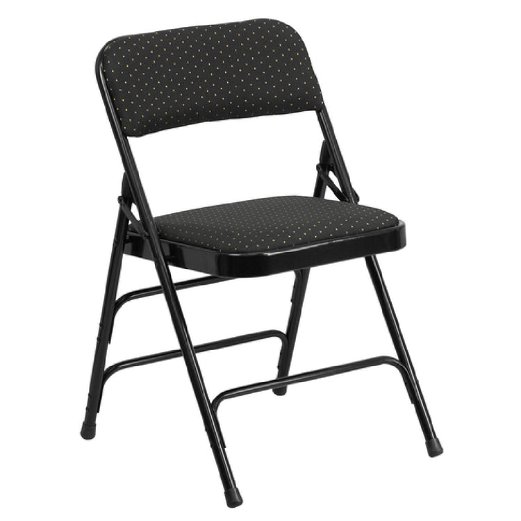 The Flash Furniture AW-MC309AF-BLK-GG Hercules Series Folding Chair is a robust, commercial-grade seating solution designed for versatile indoor and outdoor foodservice environments. This chair features a durable 18-gauge steel frame with a black powder-coated finish, supporting a 300-pound weight capacity. The patterned fabric upholstered seat and back, combined with a 1" thick fire-retardant foam cushion, deliver both comfort and safety, making it an optimal choice for high-traffic hospitality settings seeking dependable, stackable seating with quick deployment capabilities.