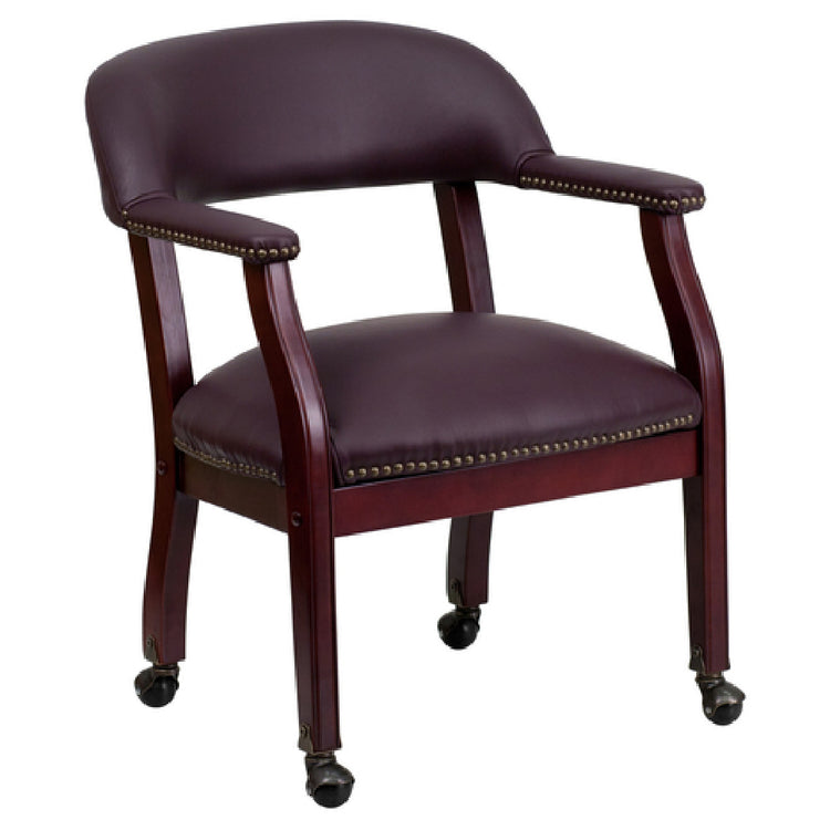 The Flash Furniture B-Z100-LF19-LEA-GG Conference Chair features a solid mahogany hardwood construction with a top grain Italian leather upholstered seat and open back for optimal comfort and airflow. Its dimensions include a height of 31.5 inches, width of 24 inches, and depth of 27 inches, with a total weight of 27.62 pounds for easy repositioning. The chair is designed without electrical components, relying solely on its structural materials for durability. Its brass nailhead trim adds to its aesthetic appeal while providing reinforcement. The solid hardwood frame withstands extensive commercial use, making it suitable for frequent, long-term seating in upscale professional environments. Maintenance involves regular cleaning of leather surfaces, and mobility is facilitated by brass hooded ball casters compatible with various flooring types.