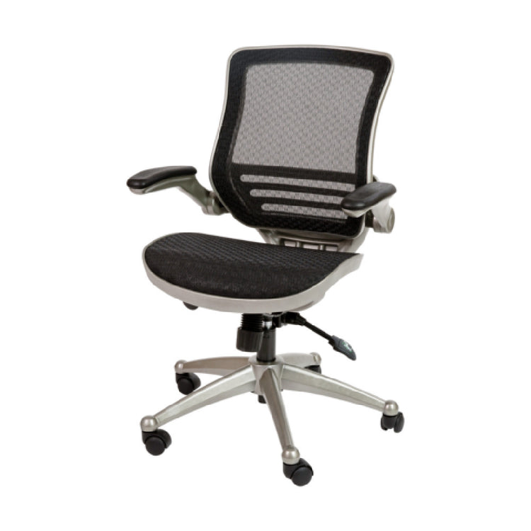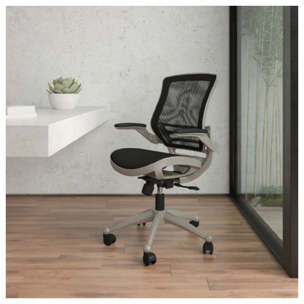 The Flash Furniture BL-8801X-BK-GR-GG Warfield Executive Swivel Chair is a professional-grade ergonomic seating solution designed for sophisticated office environments. Engineered with a mid-back mesh design, this chair provides optimal lumbar support and breathable comfort. Its adjustable height range of 37" to 41" and a robust 300 lb. weight capacity make it suitable for diverse workloads. The chair features a padded flip-up armrest and a heavy-duty silver graphite nylon base, consolidating both durability and functionality in workspace optimization. Precision pneumatic controls allow for seamless seat height adjustments, ensuring ergonomic positioning for prolonged use in executive offices or conference rooms.