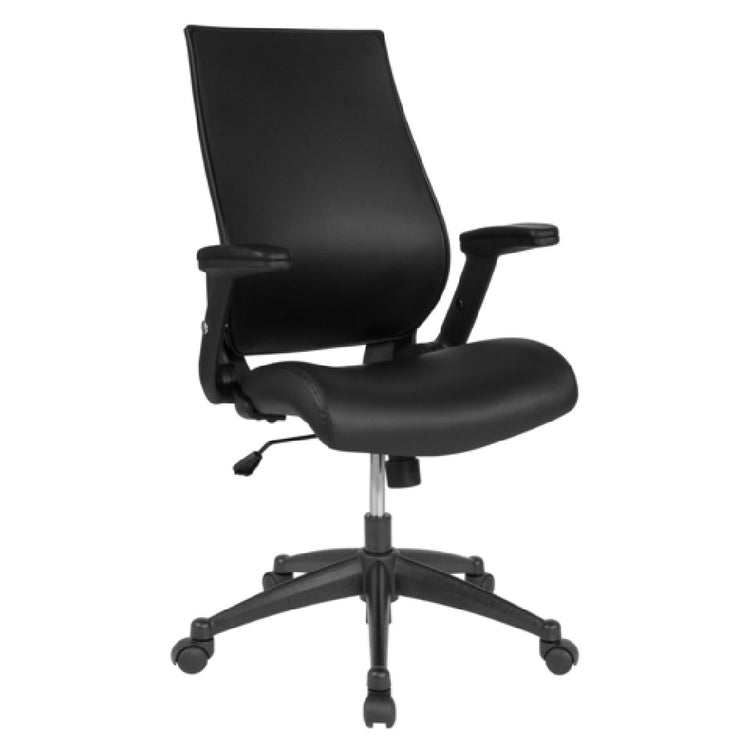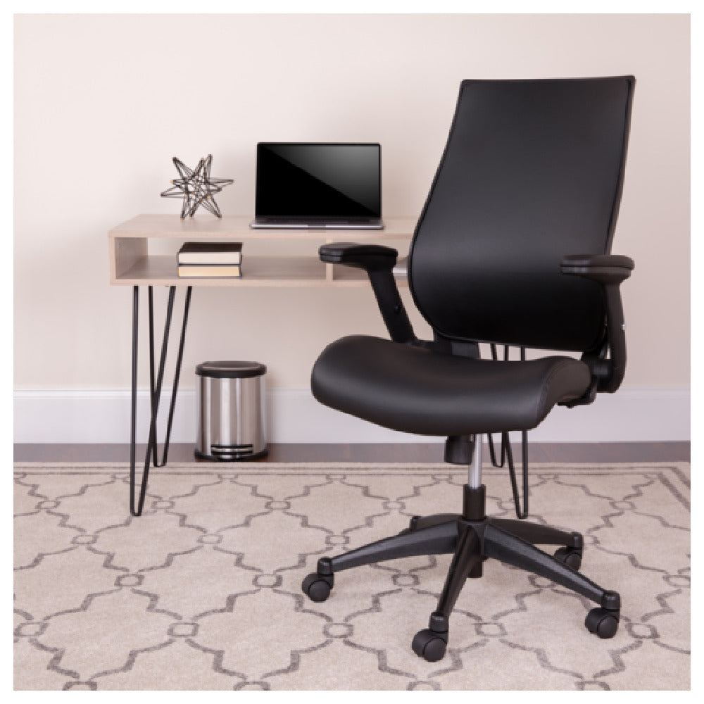 Flash Furniture, BL-LB-8809-LEA-GG, Waylon Swivel Office Chair, 40-1/4" - 44-1/4" adjustable height, 250 lb. weight capacity, high-back design, molded foam seat, built-in lumbar support, tilt lock mechanism, tilt tension adjustment knob, CA117 fire retardant foam, swivel seat, pneumatic seat height adjustment, height adjustable padded arms, heavy duty nylon base, dual wheel casters, Leathersoft, black (assembly required)