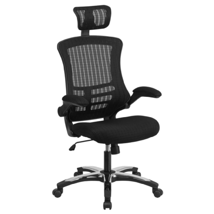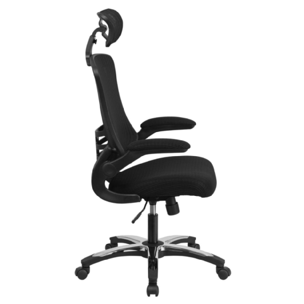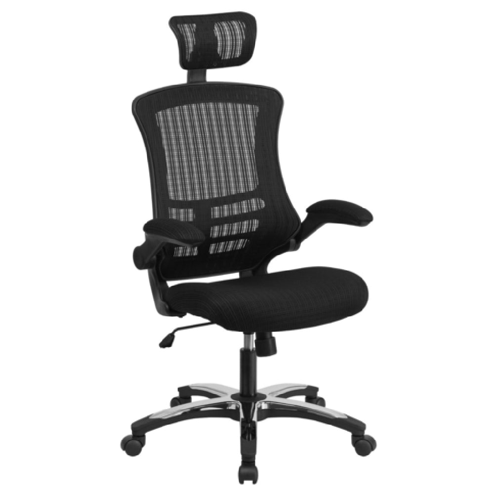 Flash Furniture, BL-X-5H-GG, Executive Swivel Office Chair, 47-1/2" to 52-1/2" adjustable height, 250 lb. weight capacity, high back design, adjustable headrest, ventilated mesh back, padded mesh upholstered waterfall seat, built-in lumbar support, tilt lock mechanism, tilt tension adjustment knob, padded flip-up arms, CA117 fire retardant foam, heavy duty black nylon base with chrome plated accents, dual wheel casters, black (assembly required) (in stock items usually ship within 24 hours)