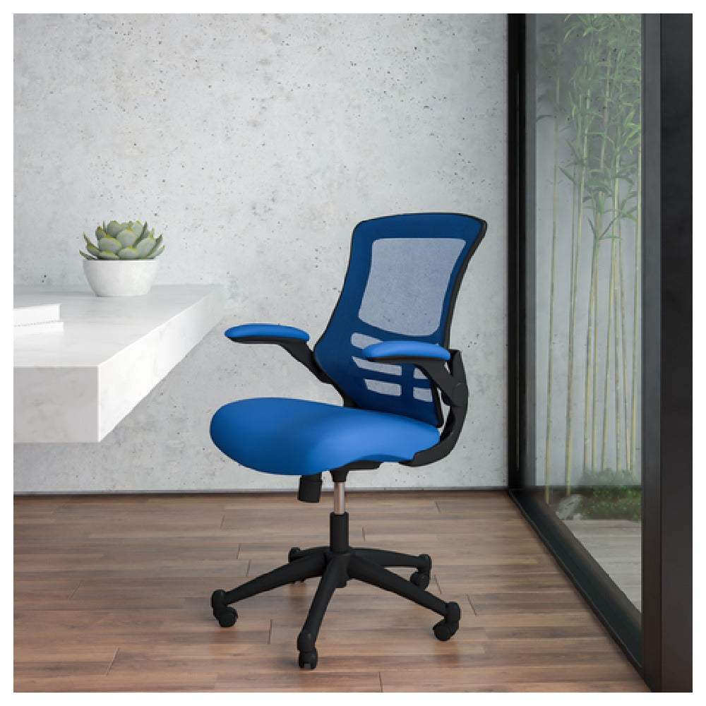 The Flash Furniture BL-X-5M-BLUE-GG swivel task chair provides commercial-grade support with a ventilated mesh back and adjustable height for versatile workspaces. Designed for moderate workloads, its heavy-duty nylon base with dual-wheel casters ensures durability and mobility, while the tilt lock mechanism and lumbar support enhance ergonomic comfort during extended periods of sitting. The padded flip-up arms facilitate easy transition between work and rest, making it ideal for offices and workstations requiring reliable, adjustable seating.