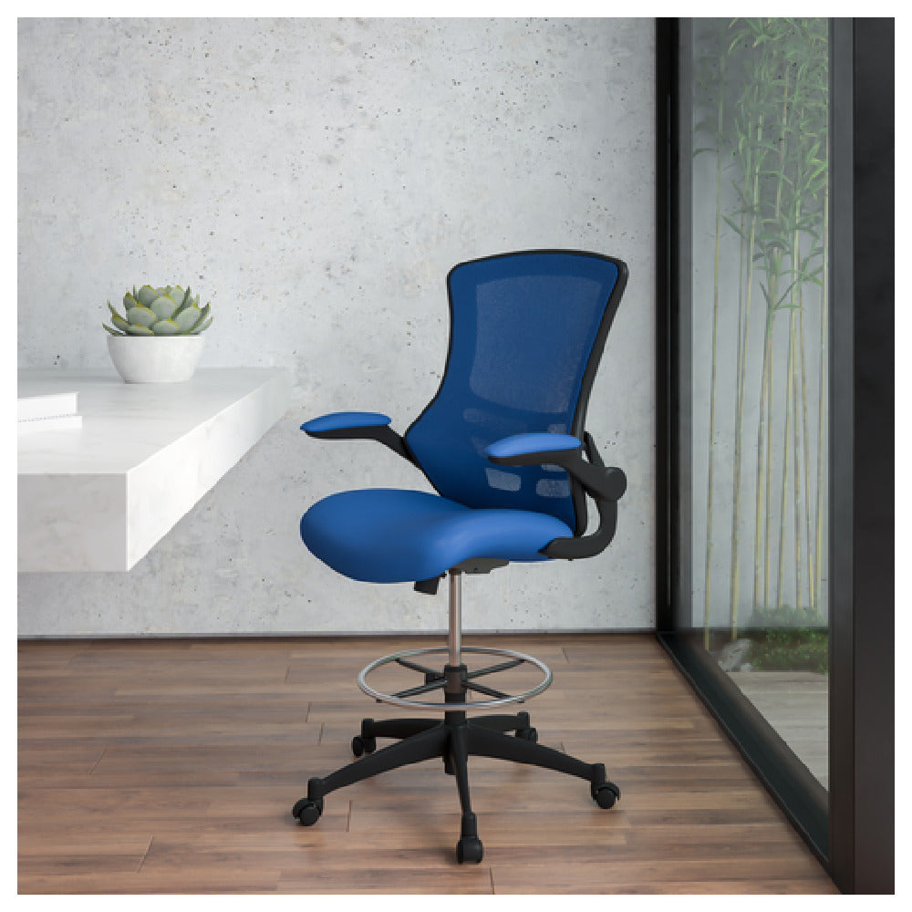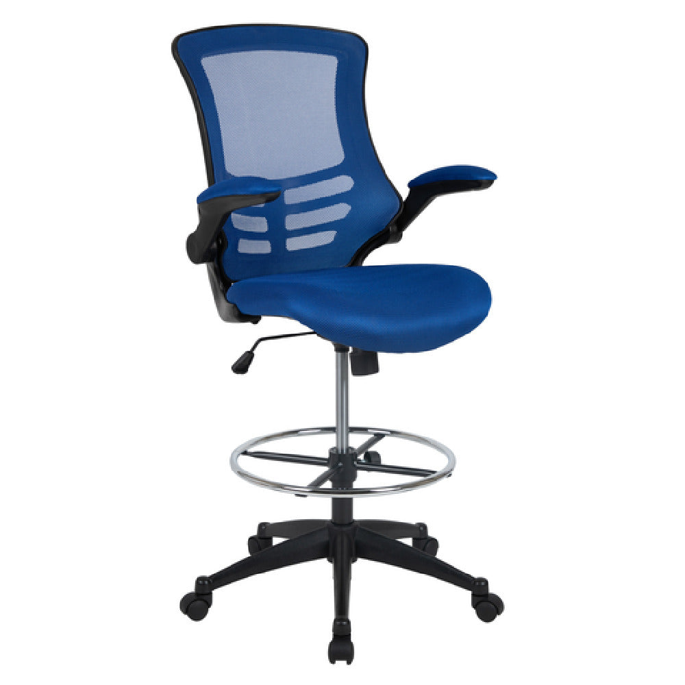 Flash Furniture, BL-X-5M-D-BLUE-GG, Swivel Drafting Chair, 43-1/4" to 50-3/4" adjustable height, 250 lb. weight capacity, mid-back design, ventilated mesh back, padded mesh upholstered waterfall seat, built-in lumbar support, tilt lock mechanism, tilt tension adjustment knob, padded flip-up arms, CA117 fire retardant foam, adjustable chrome foot ring, heavy duty black nylon base, dual wheel casters, blue (assembly required) (in stock items usually ship within 24 hours)