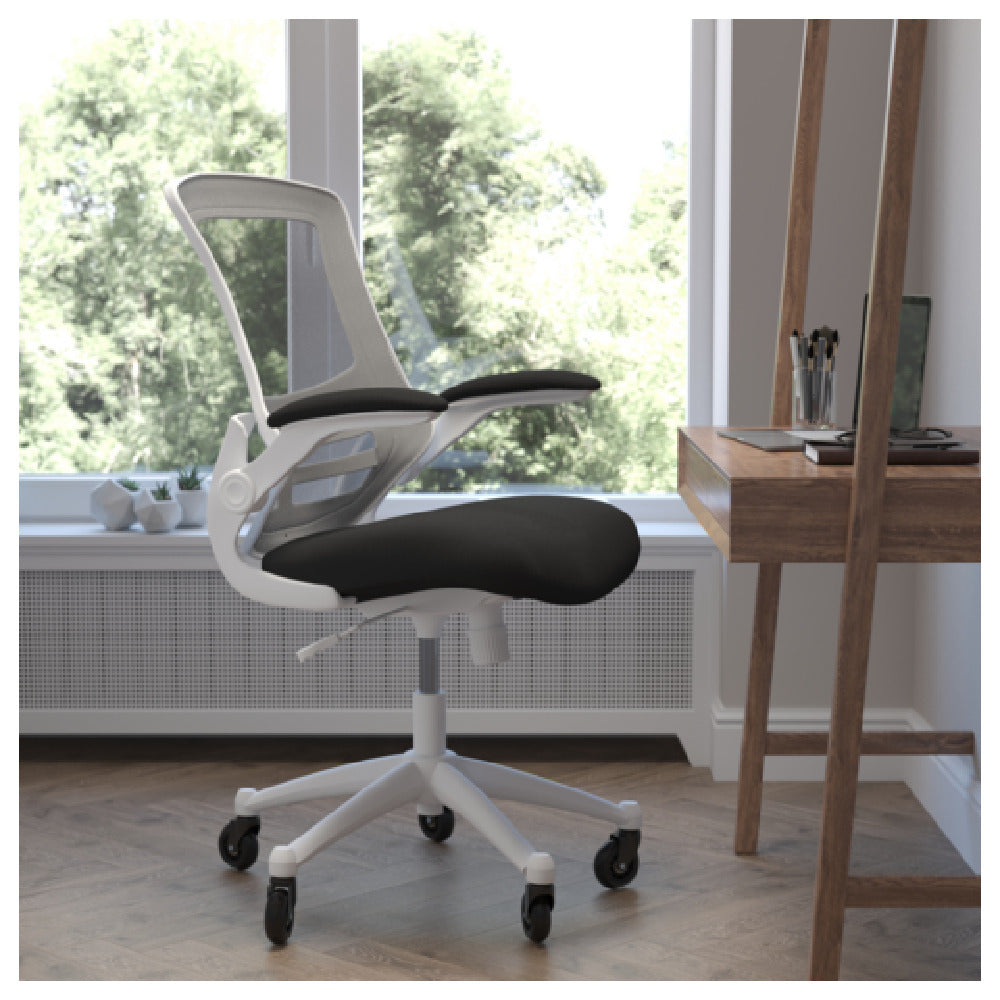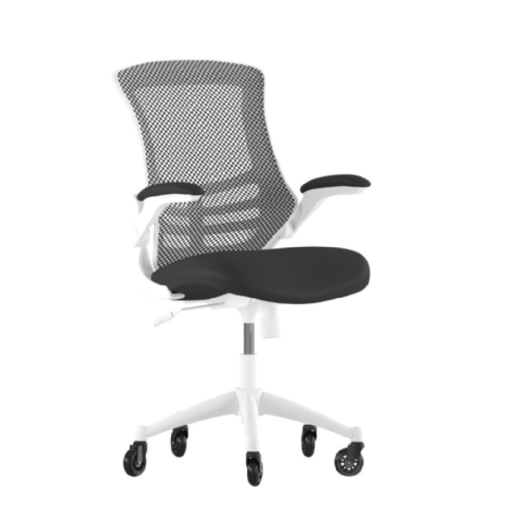 Flash Furniture, BL-X-5M-WH-BK-RLB-GG, Kelista Swivel Task Chair, 37-1/2" to 41-1/4" adjustable height, 250 lb. weight capacity, mid-back design, ventilated mesh back, padded upholstered waterfall seat, built-in lumbar support, tilt lock mechanism, tilt tension adjustment knob, padded flip-up arms, heavy duty white nylon base, ball-bearing roller wheels, black (assembly required)