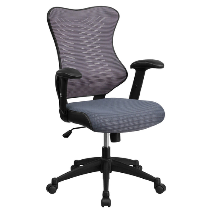 The Flash Furniture BL-ZP-806-GY-GG Designer Executive Swivel Office Chair is a professional-grade seating solution designed for optimal comfort and durability in corporate and commercial environments. This high-back swivel chair features a ventilated mesh back for enhanced airflow, a padded mesh upholstered waterfall seat for ergonomic support, and a built-in lumbar support system. With an adjustable height range of 39" to 42-3/4", it accommodates various user preferences and desk heights. The chair supports up to 250 lbs and is constructed with a sturdy black nylon base equipped with dual-wheel casters for smooth mobility. Its tilt lock and tension adjustment mechanisms allow for customized comfort, while height-adjustable padded arms provide additional ergonomic benefits. Manufactured with fire-retardant foam for safety, this model combines functionality with premium materials suited for office environments that demand reliable, long-lasting seating solutions.